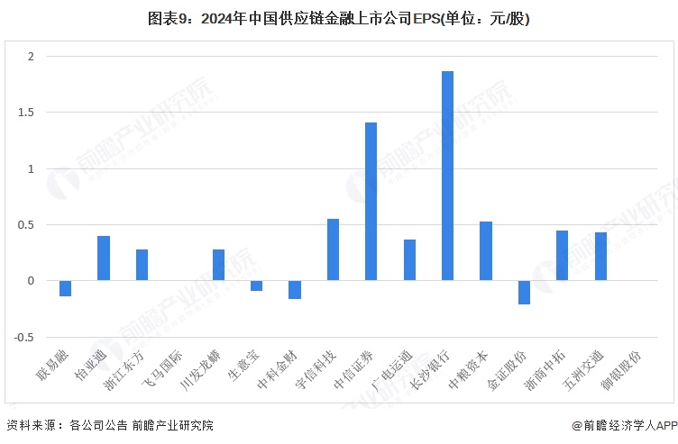 2024年,供应链金融上市企业每股收益表现分化。长沙银行以1.87元/股领先,中信证券1.41元/股、宇信科技0.55元/股、中粮资本0.53元/股也表现较好,怡亚通、浙商中拓等EPS在0.4元/股左右。而联易融、生意宝、中科金财、金证股份则为负,飞马国际和御银股份仅0.01元/股。