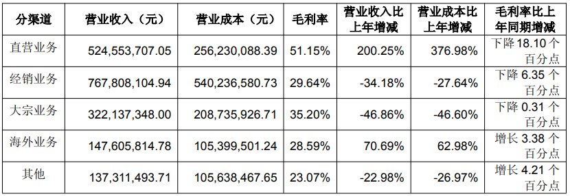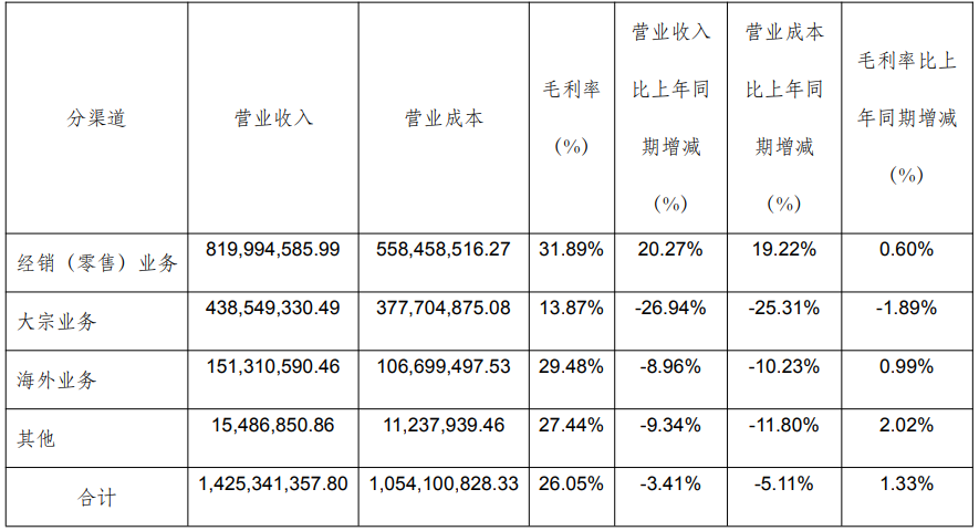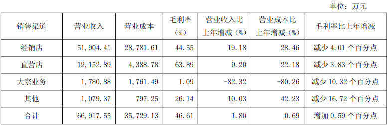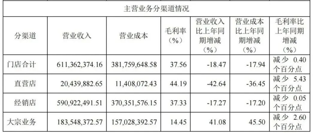 分渠道来看,经销店、直营店均实现高位增长,其中经销店营收5.19亿元,同比增长19.18%;直营店营收1.22亿元,同比增长9.20%。