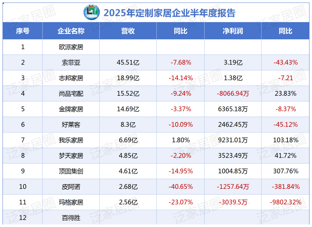 截至8月27日晚,索菲亚、志邦、尚品宅配、金牌、好莱客、我乐、顶固、梦天、皮阿诺、玛格等10大定制企业皆已发布2025年半年度业绩报告。详细数据如下: