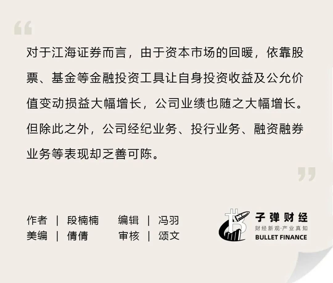 除投资收益及公允价值变动损益大幅增长之外,江海证券经纪业务、融资融券业务、资产管理业务及投行业务并无亮点可言。