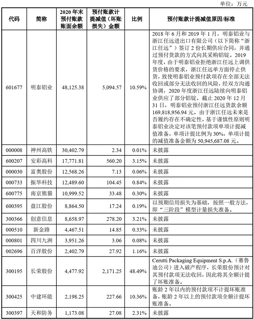 根据部分A股上市公司2020年年度报告披露内容,对预付账款计提减值的部分公司情况如下: