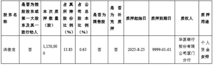 公司于近日收到实际控制人之一洪俊龙先生的通知,获悉洪俊龙先生将其所持有公司的部分股份办理了质押业务。