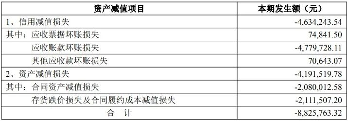 公司2025年半年度对相关资产计提资产减值损失和信用减值损失总额为8,825,763.32元,具体情况如下: