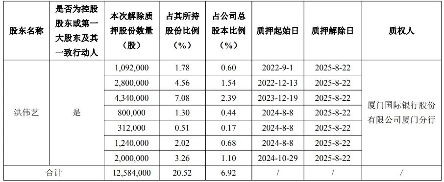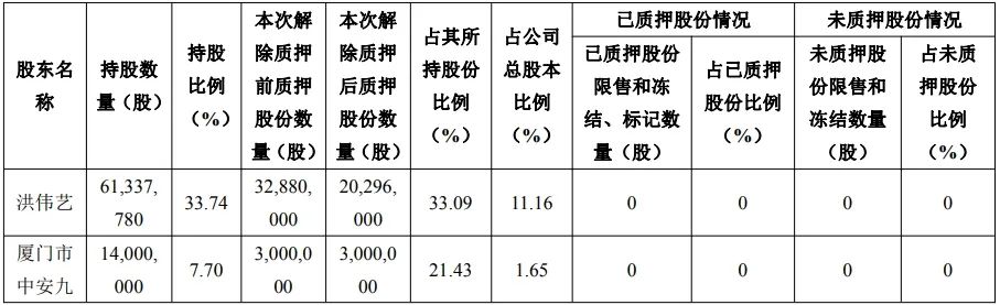 公司于近日收到公司控股股东、实际控制人之一洪伟艺先生的通知,获悉洪伟艺先生所持有公司的部分股份已解除质押。