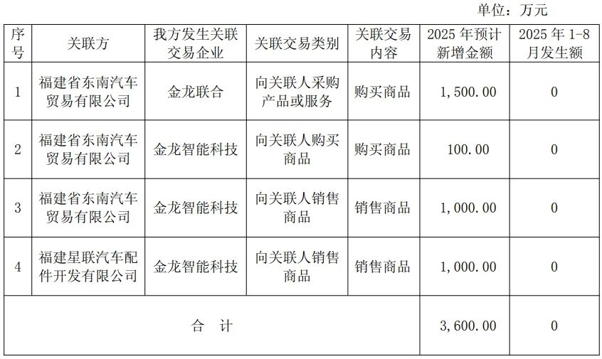 公司子公司厦门金龙联合汽车工业有限公司和厦门金龙汽车智能科技有限公司,现因生产经营的需要,预计2025年全年需增加关联交易额3,600.00万元,具体情况如下: