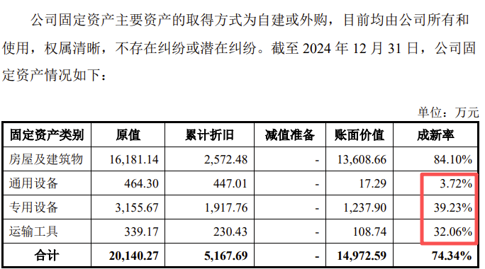 截至2024年末,公司通用设备、专用设备、运输工具账面价值分别为17万元、1238万元、109万元,成新率分别只有3.72%、39.23%、32.06%。这说明公司在最近数年购买通用设备、专用设备、运输工具较少。
