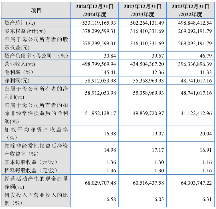 报告期内,公司营业收入分别为39,633.69万元、43,450.44万元和49,879.96万元,扣非归母净利润分别为4,112.24万元、4,983.97万元和5,195.21万元。