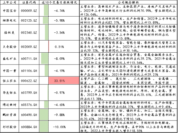 镍相关股票:兴业矿业(000426)、湘潭电化(002125)、格林美(002340)、天奇股份(002009)、盛屯矿业(600711)、腾远钴业(301219)、盛达资源(000603)、中国中冶(601618)、中国一重(601618)、中金岭南(000060)、铜陵有色(000630)、恒立实业(000622)、华友钴业(603799)、博迁新材(605376)、鹏欣资源(600490)、西部矿业(601168)、金圆股份(000546)、洛阳钼业(603993)、蓝晓科技(300487)、合纵科技(300477)、浙富控股(002266)、道氏技术(300409)杉杉股份(600884)、青岛中程(300208)