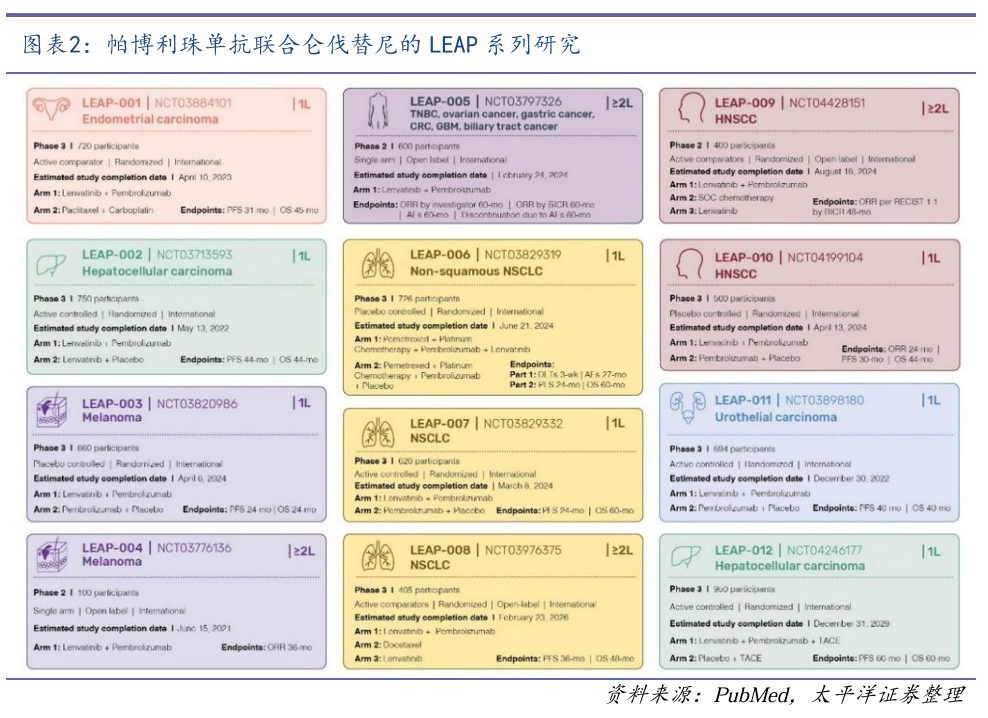 IO+VEGF联用III期临床喜忧参半。IO+VEGF组合在肝癌、肾细胞癌的3期研究中取得成功。仑伐替尼+帕博利珠单抗的可乐组合在多个3期研究中失利:LEAP-001、LEAP-002、LEAP-003、LEAP-006、LEAP-007、LEAP-008、LEAP-010、LEAP-011、LEAP-015,LEAP-017研究皆失利,LAEP-012治疗非转移性肝细胞癌(uHCC)适应症成功。