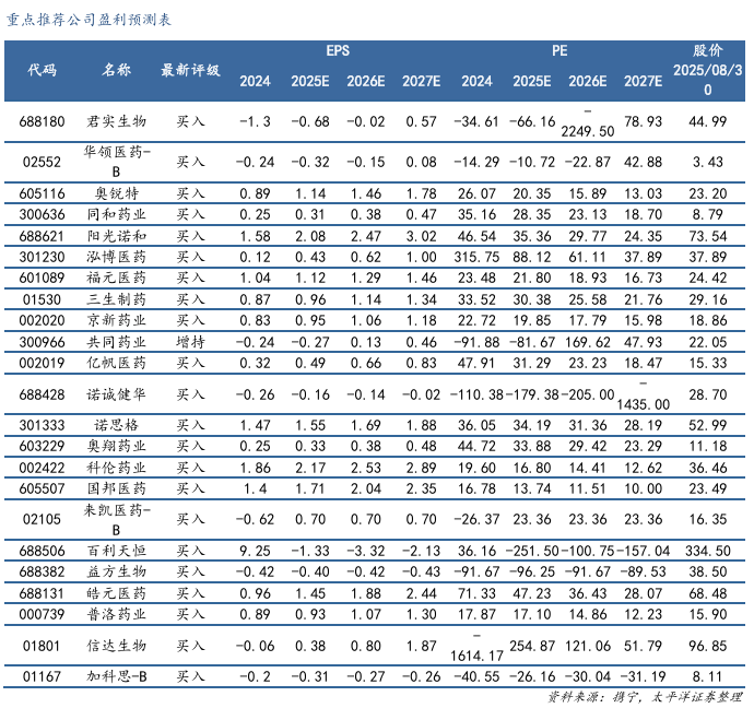 公司层面我们建议关注:1)国内创新药支持政策出台受益的国内临床CRO,如阳光诺和(688621)、诺思格(301333);2)海外业务持续复苏的生命科学上游企业,如皓元医药(688131);3)减肥药、阿尔茨海默症、ADC以及AI等概念公司,如:泓博医药(301230)等。