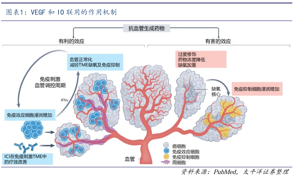 IO联用VEGF抑制剂的机制已充分阐述。VEGFR(血管内皮生长因子受体)是一类重要的跨膜酪氨酸激酶受体,在血管生成、细胞增殖和迁移等生理过程中发挥关键作用,其异常激活与多种疾病尤其是癌症的发生发展密切相关,是肿瘤治疗重要靶点之一。抗VEGF 药物类型包括:1)单克隆抗体,如贝伐珠单抗。2)小分子酪氨酸激酶抑制剂(TKI),如舒尼替尼、阿西替尼、仑伐替尼等。ICI+抗血管生成治疗具有两面性:1)可以阻断VEGF的多种免疫抑制作用,并诱导多种不同的血管调节作用以刺激免疫系统,比如血管正常化可增加肿瘤内的血液灌注和流量,抑制内皮细胞对 T 细胞的促凋亡作用等。2)VEGF阻断也可能引起抑制抗肿瘤免疫的变化,例如肿瘤缺氧增加,以及联合使用的免疫检查点抑制剂在肿瘤内的进入减少。