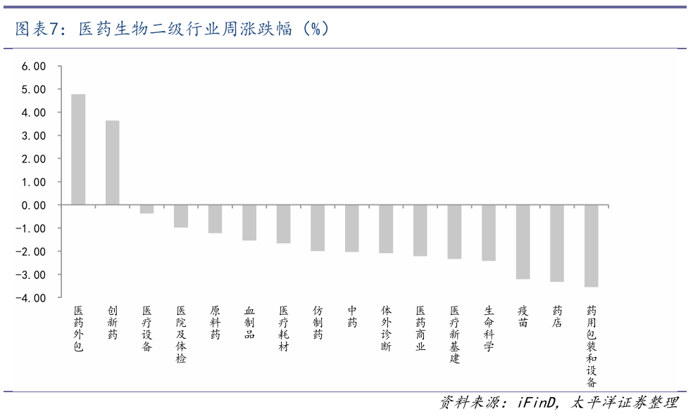 本周医药板块下跌0.65%,跑输沪深300指数3.37pct。板块内部来看,子板块中医药外包、创新药、医疗设备表现相对较好,药用包装和设备、药店、疫苗则表现居后。我们建议重视医药板块受市场定价权资金变化所带来的增量影响,尤其是阶段性布局AI医疗及创新药的投资策略: