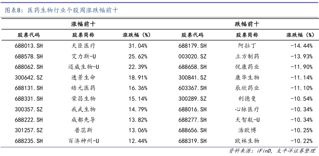本周医药板块下跌0.65%,跑输沪深300指数3.37pct。医药生物行业二级子行业中,医药外包(+4.77%)、创新药(+3.64%)、医疗设备(-0.37%)表现居前,药用包装和设备(-3.54%)、药店(-3.33%)、疫苗(-3.20%)表现居后。个股方面,周涨幅榜前3位分别为天臣医疗(+31.04%)、艾力斯-U(+25.62%)、迈威生物-U(+22.39%);周跌幅榜前3位为阿拉丁(-14.44%)、立方制药(-13.93%)、悦康药业(-11.90%)。