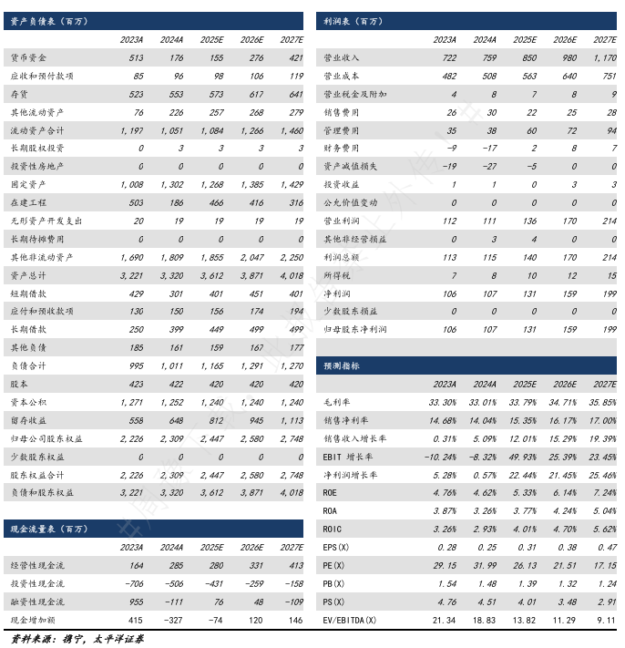 二厂区一期产能释放,二期2个车间有望于年内试生产。2024年,公司二厂区一期工程4个车间正式投产,产能持续释放,满产产值有望达到5亿元。同时公司于2023年7月完成8亿元定增,募集资金将用于二厂区二期工程建设,共规划7个车间,满产产值有望达到19亿元,当前部分车间已完成主设备的现场安装,正在安装管线及保温作业,质检研发楼内部硬装接近尾声,预计2个车间将于年内试生产。