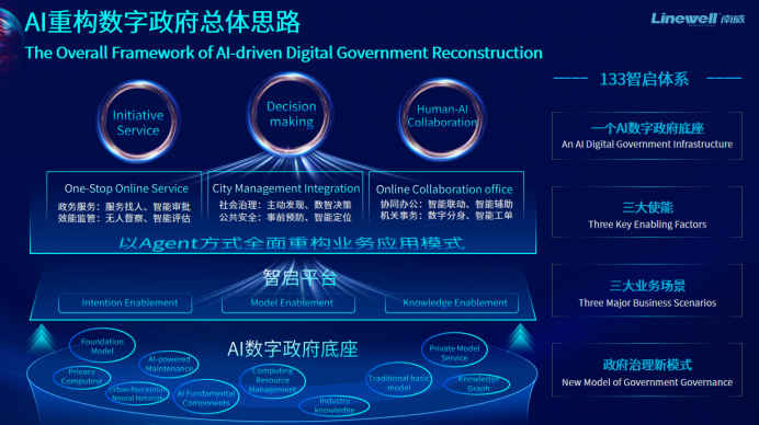 杨清晓在演讲中,详细分享了南威软件集团在数字政府领域的AI创新实践与成果。提出当前数字政府正经历从“工具辅助”到“体系重构”的关键转型,南威软件集团依托自主研发的“智启”平台,以“133智启体系”推动政府治理从“被动响应”转向“主动服务-预测决策-人机协同”的新范式,构建10大类、89个通用智能体场景以及政务服务、公共安全、城市治理、检察院办案、水库调度等领域行业智能,进一步提升政府工作质效。