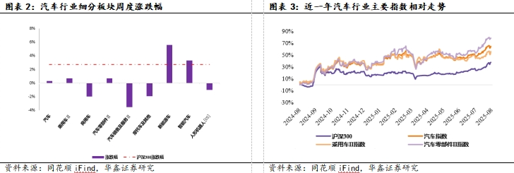 其中,乘用车涨0.7%,商用车跌2.0%,汽车零部件涨0.7%,汽车销售及服务跌3.5%,摩托车及其他跌1.9%。概念板块中,新能源车指数涨5.6%,智能汽车指数涨3.3%,人形机器人指数跌1.0%。近一年以来(截至2025年8月29日),沪深300涨36.8%,汽车、新能源车、智能汽车涨跌幅分别为66.6%、67.0%、69.5%,相对大盘的收益率分别为+29.8pct、+30.1pct、+32.7pct。