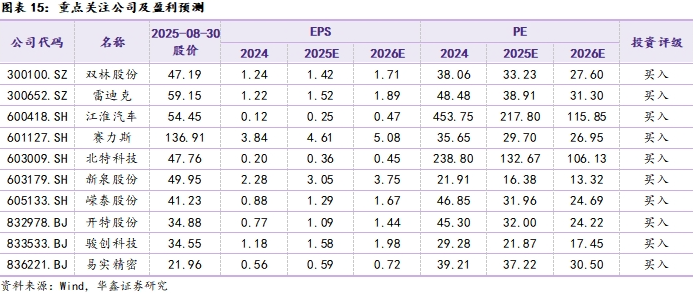 整车:建议关注与华为有深度合作的赛力斯、江淮汽车等;汽车零部件:下游格局重塑、技术变迁叠加零部件出海,国产零部件迎来发展黄金期,关注成长性赛道:①轻量化:2023Q4一体化压铸有望迎来渗透率拐点,关注文灿股份、美利信、爱柯迪、嵘泰股份、泉峰汽车;②内外饰:新泉股份、岱美股份、模塑科技、双林股份;③智能汽车:城区NOA集中落地,智能化正逐步成为整车厂竞争的核心要素,关注中国汽研、中汽股份、华阳集团、伯特利、保隆科技;④人形机器人:建议关注“汽车+机器人”双轮驱动标的,双环传动、精锻科技、贝斯特、雷迪克。⑤北交所:建议关注骏创科技、开特股份、易实精密。