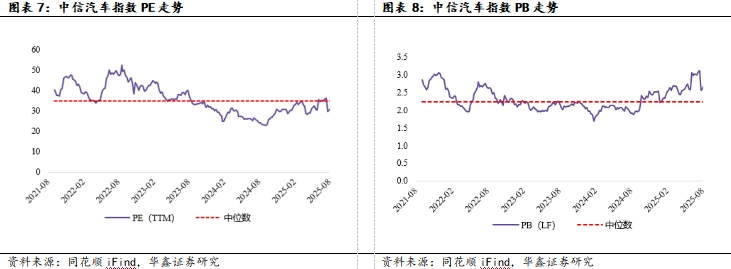 截至2025年8月29日,汽车行业PE(TTM)为33.6,位于近4年以来43.3%分位;汽车行业PB为3.0,位于近4年以来94.4%分位。
