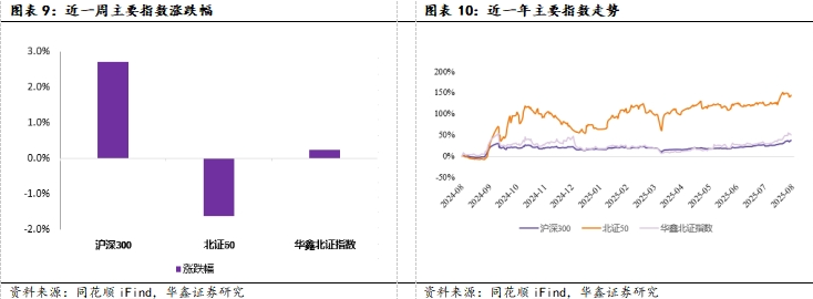 本周北证50跌1.6%,华鑫北证指数涨0.2%。近一年以来(截至2025年8月29日),北证50、华鑫北证指数涨跌幅分别为145.7%、49.7%,相对沪深300的收益率分别为+108.9pct、+12.9pct。