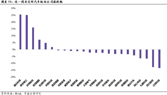 本周我们跟踪的23家北交所汽车板块公司涨跌幅均值为0.5%,中位数为-2.3%。捷众科技(25.4%)、舜宇精工(25.1%)、开特股份(16.0%)等表现居前,三祥科技(-13.5%)、同力股份(-12.8%)、久菱科技(-6.6%)等表现靠后。