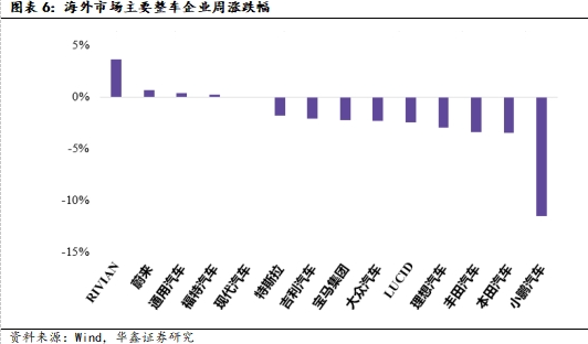 本周我们跟踪的14家海外整车厂涨跌幅均值为-1.9%,中位数为-2.2%。RIVIAN(3.7%)、蔚来(0.6%)、通用汽车(0.4%)等表现居前,小鹏汽车(-11.5%)、本田汽车(-3.5%)、丰田(-3.4%)等表现靠后。