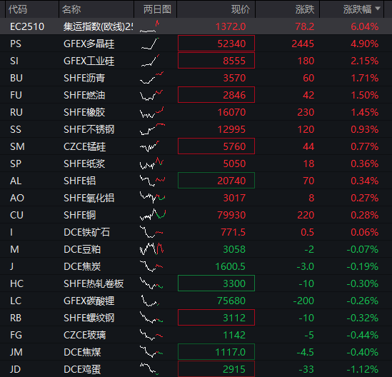 商品:国内商品期货多数上涨,截至发稿,集运指数涨超6%,多晶硅涨近5%,工业硅涨超2%,沥青、燃油、橡胶涨超1%,不锈钢、锰硅、纸浆、铝、氧化铝、铜、铁矿石等走高。豆粕、焦炭、热卷板、碳酸锂、螺纹钢、玻璃、焦煤下跌,鸡蛋跌超1%。