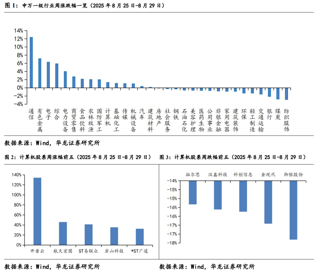 2025 年 8 月 25 日-8 月 29 日,申万计算机指数上涨1.34%。板块个股涨幅前五名分别为开普云(688228.SH)、航天宏图(688066.SH)、ST易联众(300096.SZ)、岩山科技(002195.SZ)、*ST 广道(839680.BJ)。