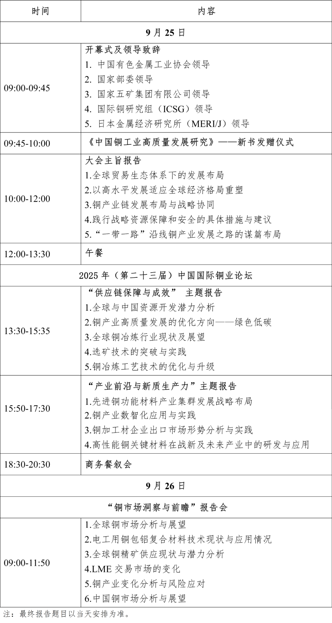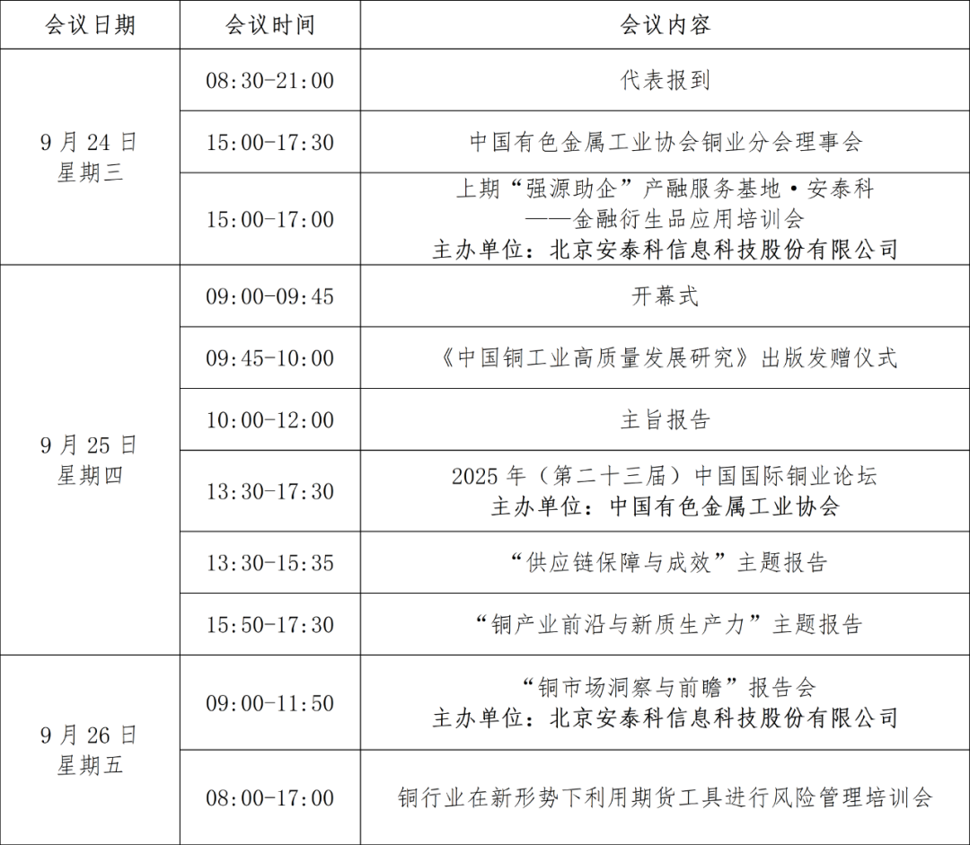 为了继续探讨世界铜工业新发展趋势,加速推动中国铜工业迈向新的目标,开创破局立新、聚势共生的高质量发展新局面。北京安泰科信息科技股份有限公司组织筹办的“2025年(第四届)中国铜业周”定于2025年9月24-26日期间在雄安新区召开,期间将举办“中国有色金属工业协会铜业分会理事会”、“2025年(第二十三届)中国国际铜业论坛”、“铜市场洞察与前瞻报告会”、“上期‘强源助企’产融服务基地·安泰科——金融衍生品应用培训会”、“铜行业在新形势下利用期货工具进行风险管理培训会”等多项专场活动。