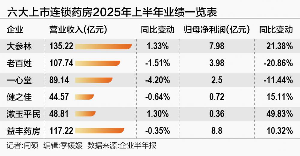 21世纪经济报道记者梳理发现,2025年上半年,六大上市连锁药房业绩依旧呈现两极分化的局面,其中大参林、漱玉平民实现营收净利双增,老百姓、一心堂实现双降。