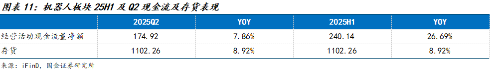 25H1机器人板块公司经营活动现金流量净额达240.14亿元,同比提升26.69%,其中汇川技术经营活动现金流量净额达到30.20亿元,同比增长65.24%。25H1末机器人板块公司存货达1102.26亿元,同比增长8.92%,其中均胜电子存货超百亿。25Q2机器人板块公司经营活动现金流量净额达174.92亿元,同比增长7.86%。