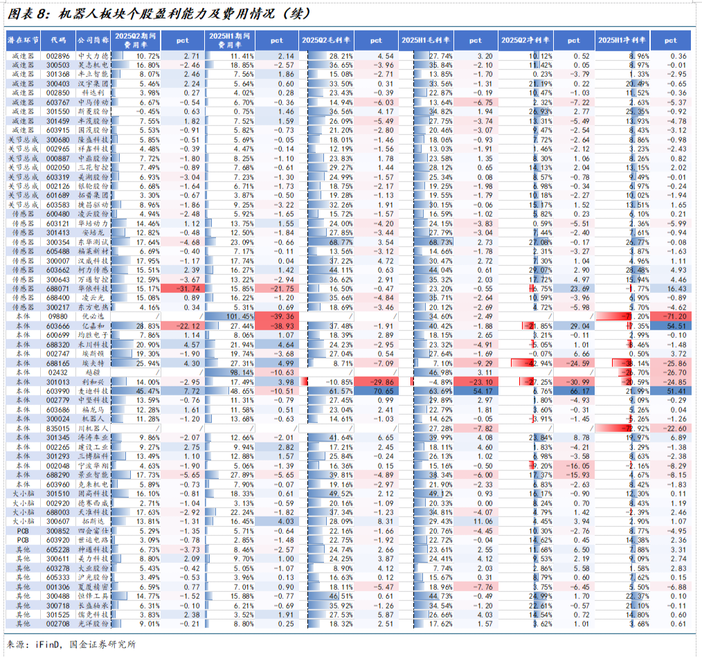 25H1机器人板块公司毛利率为21.94%,同比提升0.10pct,其中东华测试、麦迪科技毛利率最高,分别68.73%、63.69%,麦迪科技毛利率增长幅度最大,同比提升54.17pct。25H1机器人板块公司净利率为7.48%,同比下降0.01pct,其中新坐标、峰岹科技两家企业净利率超30%。25H1年机器人板块公司期间费用率为7.22%,同比下降0.70pct。2025Q2机器人板块公司毛利率达22.19%,同比提升0.31pct,净利率达7.42%,同比下降0.55pct,期间费用率为6.65%,同比下降0.71pct。