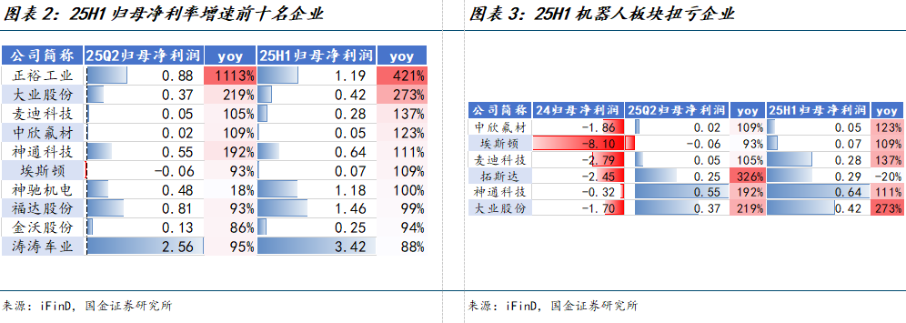 25H1&Q2机器人板块主业业绩向好,近九成公司实现盈利。25H1机器人板块120家公司主业共实现营收2888.25亿元(同比+13.81%),其中106家公司实现盈利,共实现归母净利润216.18亿元(同比+13.72%)。25Q2机器人板块公司共实现营收1532.44亿元(同比+14.65%),其中有106家公司实现盈利,共实现归母净利润113.67亿元(同比+6.80%)。分板块来看,散热件、大小脑相关标的利润增长幅度最快,关节总成、电机、丝杠、减速器板块相关标的盈利规模较大且增长稳健。从个股情况看,正裕工业、大业股份、中欣氟材、麦迪科技、埃斯顿、神驰机电、神通科技7家公司25H1归母净利润同比增长率超过100%,25Q2正裕工业归母净利润同比增长率达到1133.26%,天准科技25Q2实现扭亏为盈,奥比中光、中欣氟材、埃斯顿、麦迪科技、拓斯达、神通科技、大业股份6家公司25H1实现扭亏。
