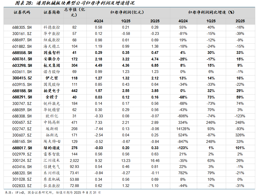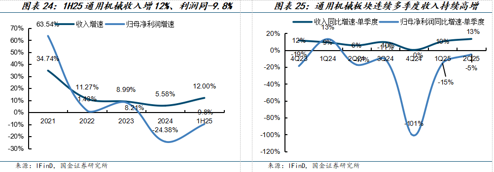 1H25,通用机械行业收入同比+12%;由于竞争激烈,归母净利润同比下滑9.8%,趋势收窄。单二季度看,通用机械行业收入同比+13%,归母净利润同比下滑5%,趋势收窄。
