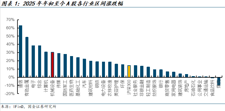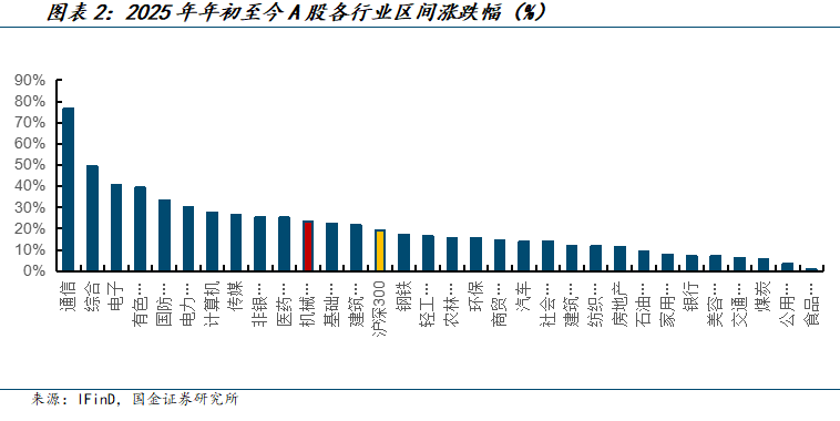 2025年年初至今,申万机械行业绝对收益30%,跑赢沪深300指数,相对收益16.13%。机械行业在申万31个行业中排名第6。