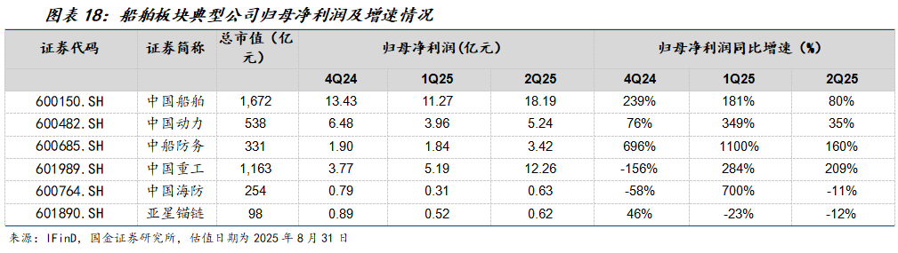 头部船企利润进入加速释放期。2Q25,中国中船、中国重工、中船防务例如快速释放。