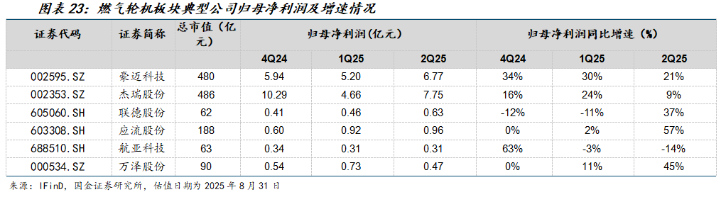 燃气轮机:全球需求景气上行,国产产业链加速国产替代。燃气轮机作为AI数据中心未来稳定的电力来源,在全球AI资本开支加速放量下,需求景气度快速上行。叠加中国燃气轮机加速国产替代,燃气轮机产业链需求快速增长。全球需求景气上行,国产产业链加速国产替代。1H25燃气轮机板块收入151亿元、同比+28.4%;归母净利润实现29亿元、同比+18%;单二季度看,燃气轮机板块营收同比+34%;归母净利润实现同比+17%。单二季度看,核心产业链公司应流股份、万泽股份、联德股份实现归母净利润增速分别为同比+57%、+45%、+37%。