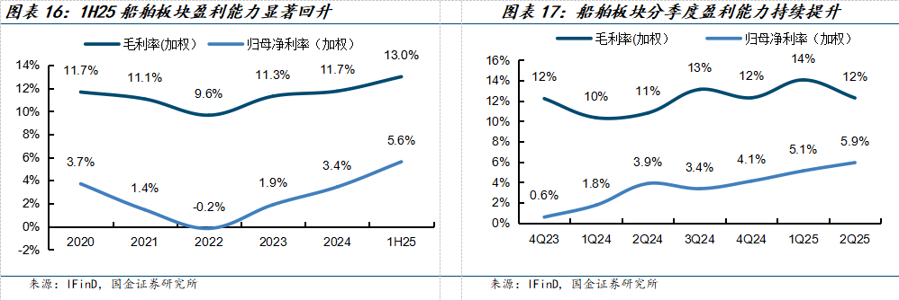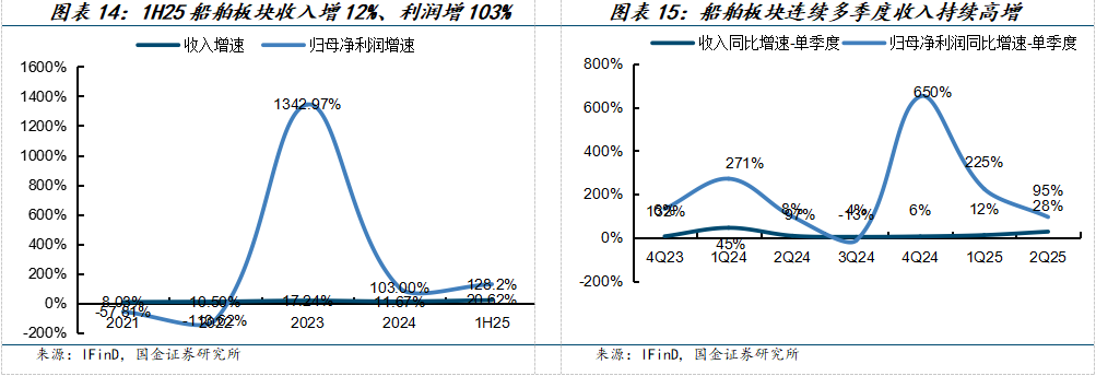 1H25船舶行业收入1131亿元、同比+20.67%;归母净利润实现63.5亿元、同比+128%;单二季度看,船舶行业营收同比+28%;归母净利润实现同比+95%。