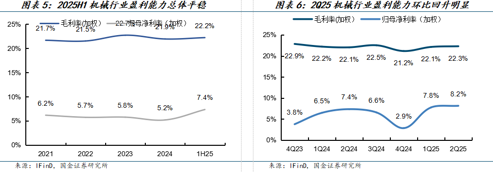 从盈利能力方面看,净利率逐季度回升。2025H1机械行业综合毛利率22.2%,较24年提升0.3pct;归母净利率7.4%,较24年提升1.8pct。2Q25机械行业毛利率22.3%,归母净利率8.2%,逐季度回升。