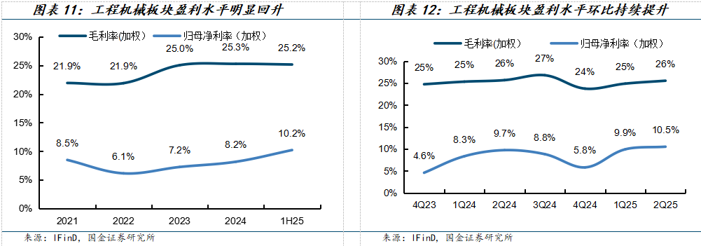 工程机械:期复苏带动业绩兑现,看好中长期海内外周期景气上行。今年以来,挖掘机销量呈现迅速回升态势。据中国工程机械工业协会数据,7月国内挖掘机主要制造企业销售各类挖掘机1.7万台,同比增长25.2%,其中国内销量7306台(同比+17.2%)、出口量9832台(同比+31.9%);1-7月累计销量13.778台(同比+17.8%),其中国内销量7.29万台(同比+22.3%)、出口6.47万台(同比+13%),2025年行业已实现从“弱复苏”到“强反转”的质变。1H25工程机械行业营收实现2058亿元、同比+8.9%;归母净利润实现126.8亿元、同比+22.8%;单二季度看,实现营收同比+8%;归母净利润实现同比+16%。1H25工程机械行业整体毛利率25.2%,归母净利率10.2%、相比24年提升2pcts。2Q25,工程机械行业整体毛利率26%,净利率10.5%、同比提升0.8pcts。