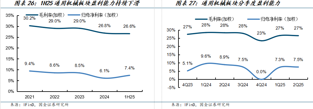 竞争激烈导致盈利能力持续下滑。1H25通用机械行业整体毛利率26.6%,相比24年下滑0.2pcts;归母净利率7.4%,相比24年提升1.3pcts。2Q25,通用机械行业整体毛利率27%,同比下降0.5pcts;归母净利率7.5%,同比下降-1.4pcts。
