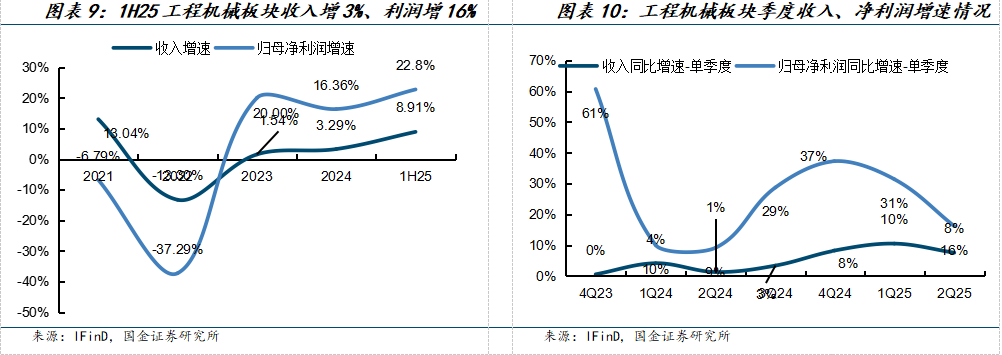 1H25工程机械行业营收实现2058亿元、同比+8.9%;归母净利润实现126.8亿元、同比+22.8%;单二季度看,工程机械行业营收同比+8%;归母净利润实现同比+16%。