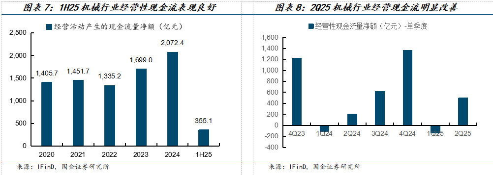 从现金流情况看,机械行业现金流水平改善明显。2025H1机械行业整体现金流情况良好,经营性现金流量净额为355亿元,同比大幅提升,2Q25经营性现金流净额回升显著。