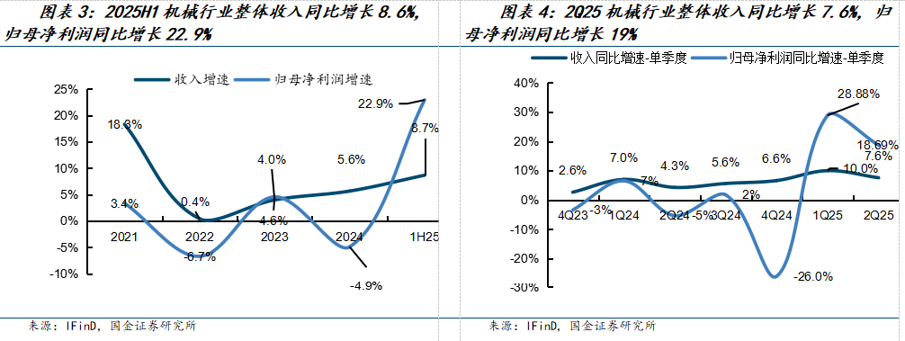 总体:需求温和复苏,盈利能力、现金流改善明显。(1)样本统计来自申万分类的申万机械设备行业以及申万国防军工(8家)共598家公司。1H25,机械行业实现收入11245亿元、同比增长8.6%;实现归母净利润827亿元,同比增长22.9%。单二季度,机械行业实现收入6175亿元、同比增长7.6%;实现归母净利润466.5亿元,同比增长19%。逐季度看,收入呈现稳健提升趋势。(2)从盈利能力看,1H25,机械行业综合毛利率22.2%,较24年提升0.3pcts;归母净利率7.4%,较24年提升1.8pcts。(3)机械行业整体现金流情况良好,经营性现金流量净额为355亿元,同比大幅提升,2Q25经营性现金流净额294亿元、同比+129%。