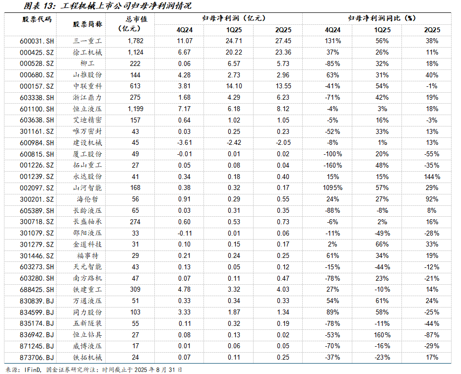 龙头公司表现抢眼,单二季度,三一重工、山推股份、徐工机械、浙江鼎力实现归母净利润同比+38%、+40%、+11%、+19%。