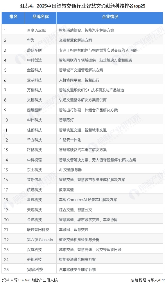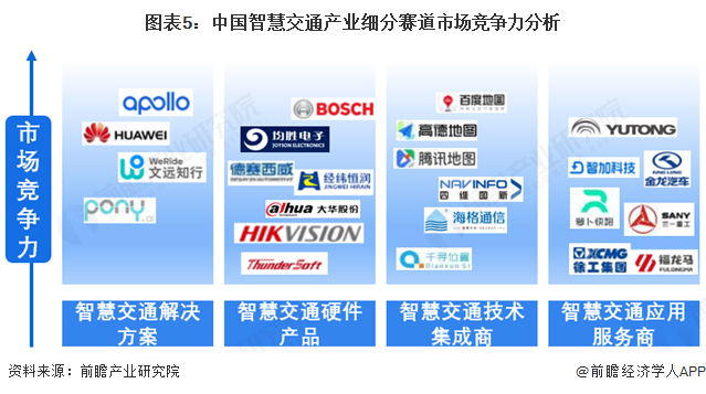 根据细分赛道来看,智慧交通解决方案商主要企业有百度Apollo,华为、文远知行、pony等,这类企业依托深厚的AI算法、车路协同技术积累及平台整合能力,可提供从感知、决策到控制的全栈解决方案,满足交通系统智能化升级的整体需求,核心竞争力在于技术集成与场景落地能力;