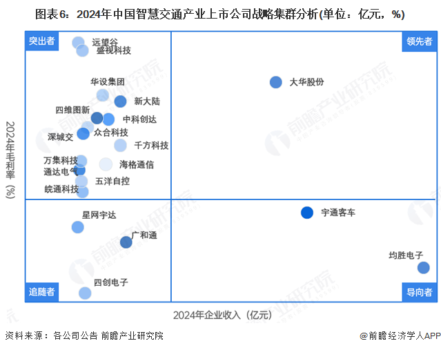 根据2024年营收以及毛利率来看,市场导向者是均胜电子、宇通客车,在汽车制造、零部件等方面有规模化优势,为智慧车联和车路协同技术提供了良好的载体,有体现智慧交通软硬件一体的解决方案竞争力。市场领先者目前是大华股份,公司通过视频存储、前端、显示控制和智能交通等系列化产品打造了综合智慧物联产品及方案,在收入和毛利率上有较好的表现;目前市场突出者众多,依靠数据资源技术和硬件供应体系,在获利能力上有较好表现,但是行业市场竞争激烈,市场业务拓展有待提升;目前在10-15%左右毛利率的企业是星网宇达、广和通以及思创电子,企业目前处于追赶状态。