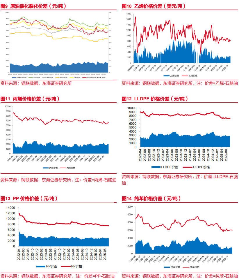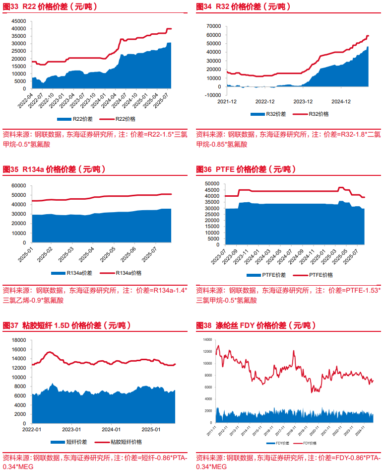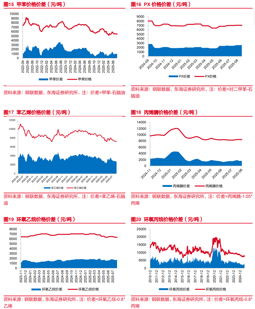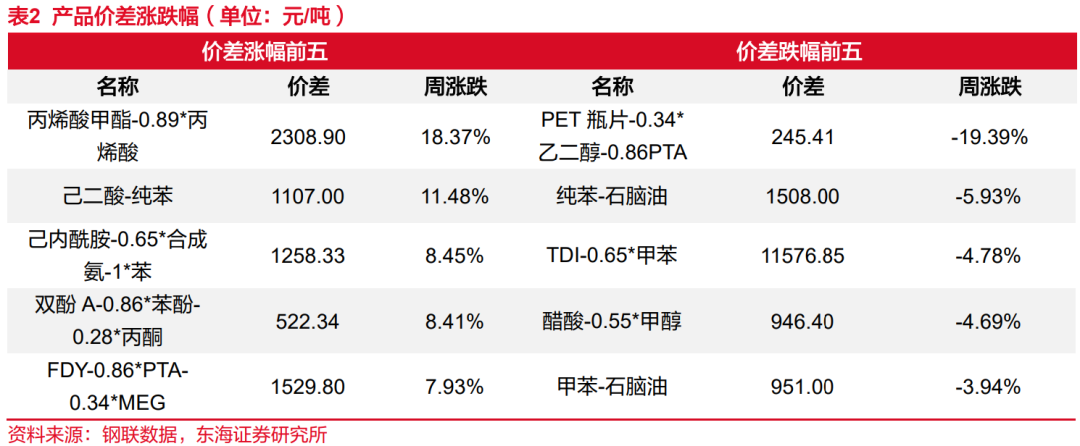 上周(2025/8/25~2025/8/29)价差涨幅靠前的品种:分别为丙烯酸甲酯-0.89*丙烯酸:18.37%;己二酸-纯苯:11.48%;己内酰胺-0.65*合成氨-1*苯:8.45%;双酚A-0.86*苯酚-0.28*丙酮:8.41%;FDY-0.86*PTA-0.34*MEG:7.93%。