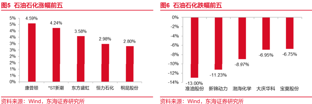 上周(2025/8/25~2025/8/29),石油石化板块涨幅居前的个股有:康普顿:4.59%;ST新潮:4.24%;东方盛虹:3.58%;恒力石化:2.98%;桐昆股份:2.80%。