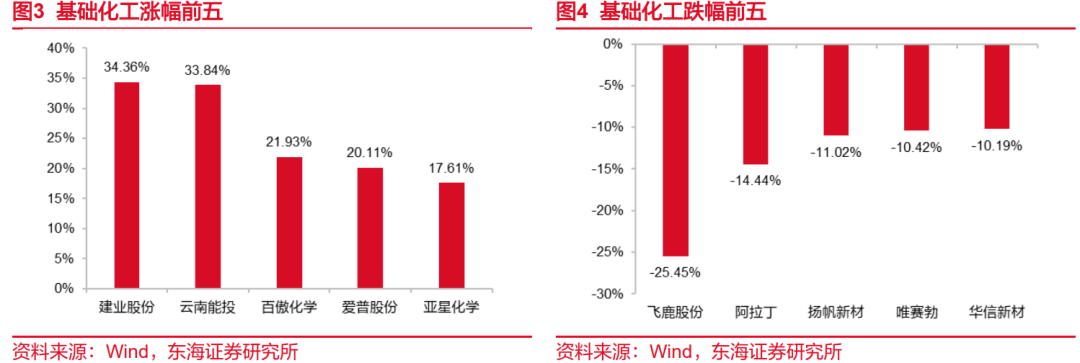 子板块涨跌幅,涨幅前五的为:氟化工:8.35%;氮肥:6.17%;煤化工:5.59%;复合肥:3.14%;农药:2.01%。跌幅前五的为:其他橡胶制品:-5.00%;涂料油墨:-3.64%;粘胶:-3.28%;油田服务:-3.11%;炭黑:-2.99%。