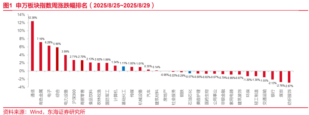 上周(2025/8/25~2025/8/29),沪深300指数上涨2.71%,申万石油石化指数下跌0.57%,跑输大盘3.28pct,申万基础化工指数上涨1.11%,跑输大盘1.60pct,涨幅在全部申万一级行业中分别位列第20位、第11位。